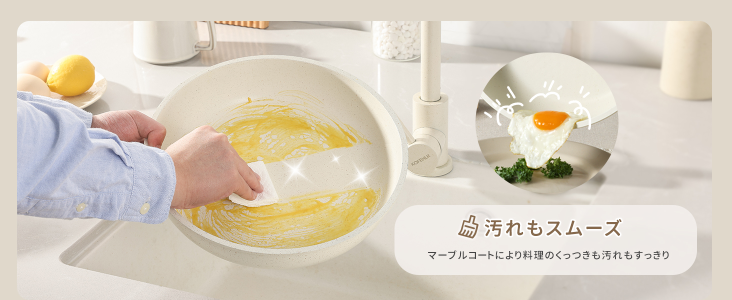 - 内面がマーブルコートをしているため、くっつきにくくスムーズに調理できます。調理後もスポンジで軽く拭くだけで、汚れもスルッと落ちます.